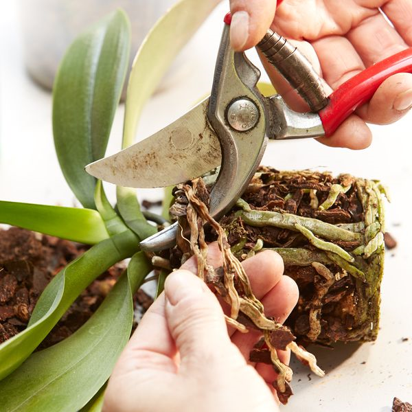 1. Ziehen Sie die Orchidee aus dem Kulturtopf. Drücken Sie ihn etwas in der Hand, falls die Orchidee nicht heraus möchte. Somit lockert sich das Substrat und Sie beschädigen die Wurzeln nicht. Sind die Wurzeln dennoch zu hartnäckig im Topf gefangen, hilft nur das vorsichtige Aufschneiden des Topfes. Achten Sie darauf, dass Sie keine Wurzel verletzen.