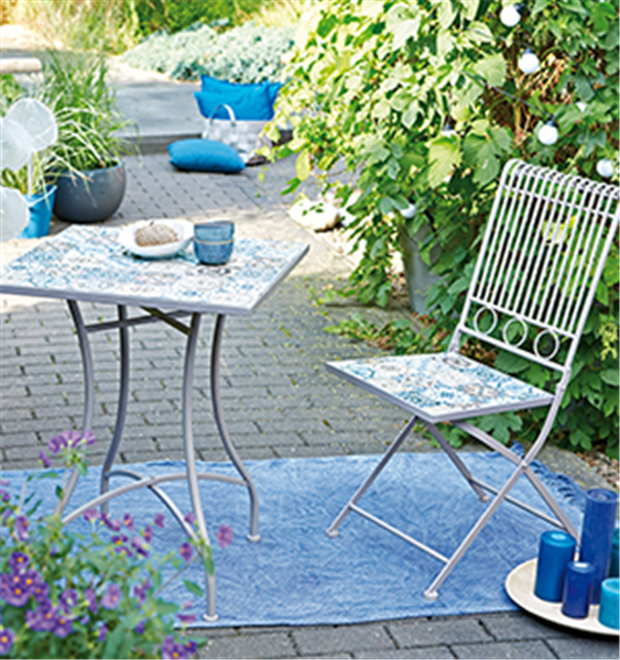 Sie lieben das Meer und denken gerne an die geselligen Stunden in Ihrem Urlaub zurück? Mit dem Muschel-Mobile haben Sie im Handumdrehen ein klangvolles und zugleich schönes Windspiel. Bringen Sie diese einfach am Balkon- oder Terrassenbalken an und lauschen Sie bei einem lauen Lüftchen dem Klang der Muscheln. Eine Sitzgruppe, die mit hübschen blau-weißen Mosaiksteinchen verziert ist, lädt zum Verweilen ein und unterstreicht einfach und gekonnt den maritimen Look ihrer Gartenfeier.